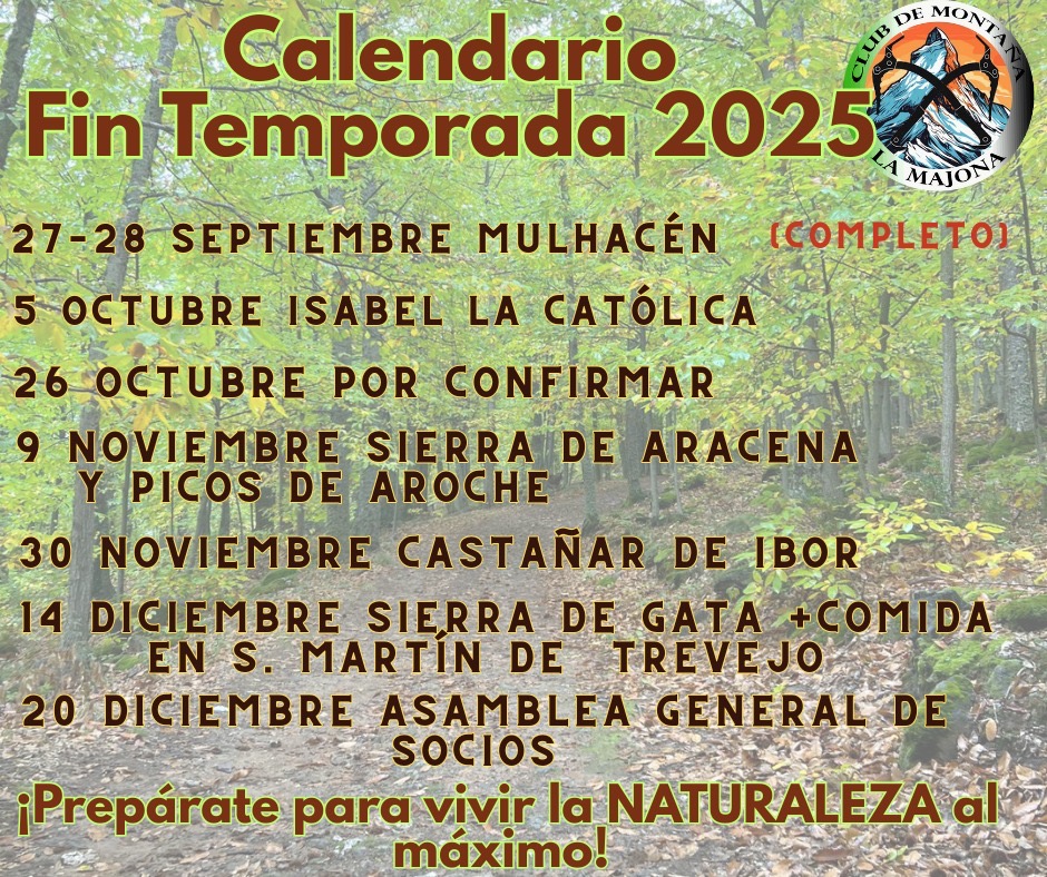 Para despedir el año, el 14 de diciembre la expedición se trasladará a la Sierra de Gata, con una comida en San Martín de Trevejo, un entorno privilegiado para cerrar la temporada en plena naturaleza. Finalmente, el 20 de diciembre tendrá lugar la asamblea general de socios, en la que se abordará la planificación del próximo año y se valorará el trabajo realizado.